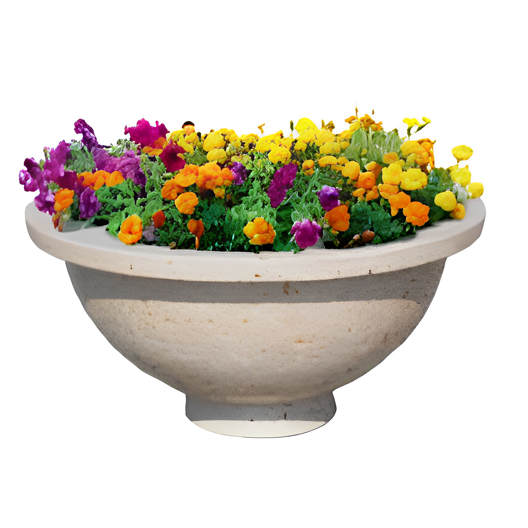 Fioriera in cemento a forma di ciotola. Realizzata in calcestruzzo bianco finto travertino, armato, vibrato e levigato, trattamento idrorepellente antidegrado per esterno, effetto naturale. Dimensione Ø cm 107x53h - peso 290 kg.