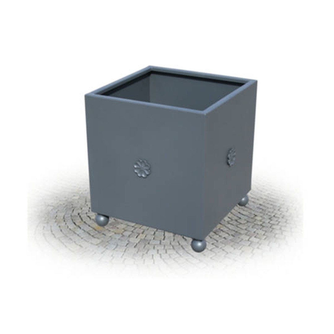 Fioriera realizzata mediante profilo sezione mm. 30x30x2 e lamiera d'acciaio zincato sp. 20/10. Nella parte inferiore sono posti quattro pomoli di ferro che fungono da supporti. Sui quattro lati sono fissati quattro elementi decorativi in fusione d'acciaio. Ancoraggio: filo al terreno. Ingombro: cm 60x60x73 h. Capacità Fioriera: 275 litri circa.