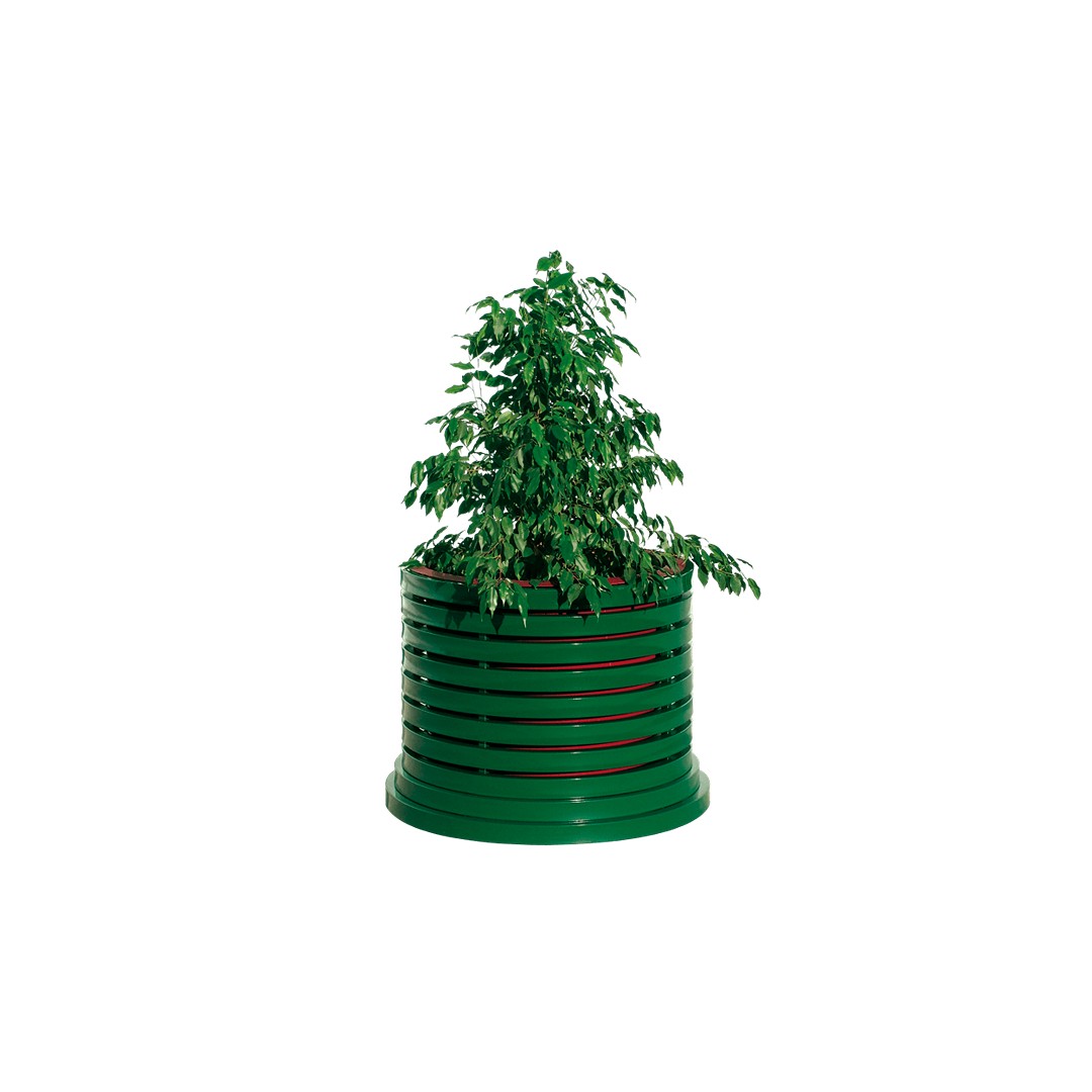 Fioriera circolare realizzata in acciaio zincato per arredo urbano. Struttura di forma circolare composta da doppio anello di base in tubo rettangolare di acciaio zincato, la base è provvista di tre piedini che evitano il contatto diretto della struttura con il terreno. Otto anelli in tubo rettangolare di acciaio zincato e un contenitore interno realizzato in vetroresina colore “rosso mattone”. La finitura base per le parti metalliche di questo prodotto è il colore “verde muschio” RAL 6005.