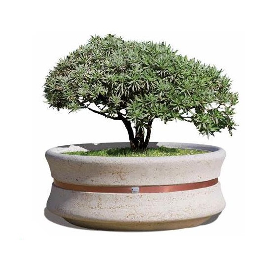 Fioriera circolare con fascia centrale decorativa in alluminio colore rame. Realizzata in calcestruzzo 5.25 bianco tipo travertino armato, levigato, trattato antidegrado. Dimensioni: Diametro cm 120 x 63 h. Ancoraggio: filo pavimento. Peso: Kg. 500 circa.