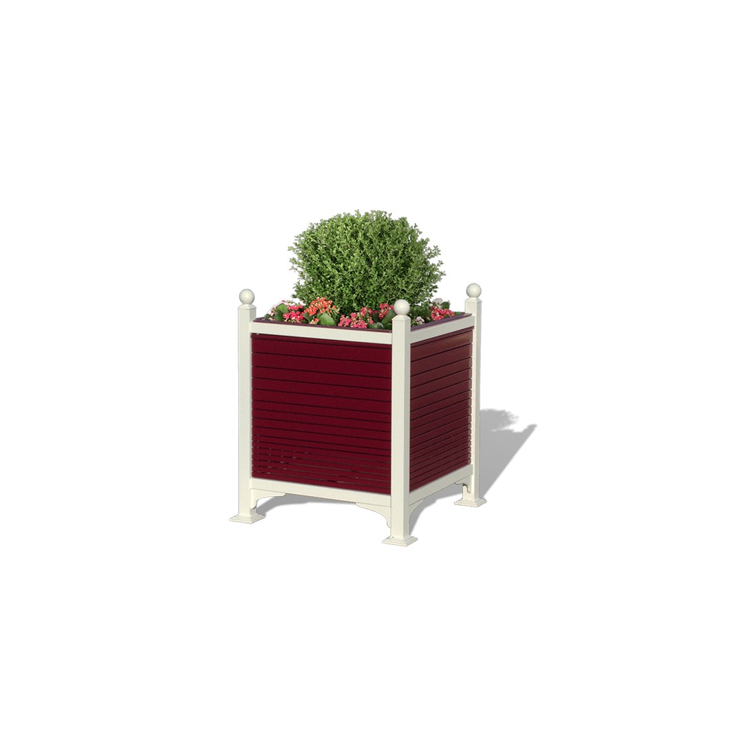 Fioriera per arredo urbano, di forma quadra. Struttura in tubolare quadro in acciaio zincato con fregi decorativi sulla parte superiore ed inferiore dei montanti. Pareti laterali realizzate con profili di acciaio zincato rettangolari, opportunamente distanziati tra loro e dallo spessore decrescente, dall'alto verso il basso, al fine di creare un effetto ottico originale. La parte interna della fioriera è completata da una robusta vasca in vetro-resina color rosso mattone che funge da contenitore per il deposito del terriccio, delle piante e dei fiori.