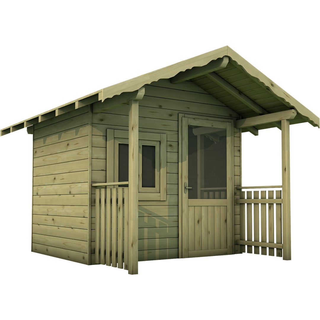 Casetta con veranda frontale studiata per il cliente che desidera un prodotto più elaborato e non un semplice ricovero da giardino. La robusta struttura in legno di pino silvestre impregnato in autoclave è completata da pareti in perline con spessore 27 mm Il tetto a 2 falde è realizzato anch’esso in perline con spessore 27 mm ed è ricoperto da uno strato di guaina impermeabilizzante ardesiata o da tegole canadesi. Disponibile in tre diverse grandezze, viene fornita in un kit di montaggio che comprende, oltre alle pareti, la veranda ed il tetto pre-assemblati, il pavimento, una porta ed una finestra complete di maniglia, serratura e vetro. Su richiesta è possibile la produzione in legno di larice. Dimensioni 250 x 300 x h 265 cm