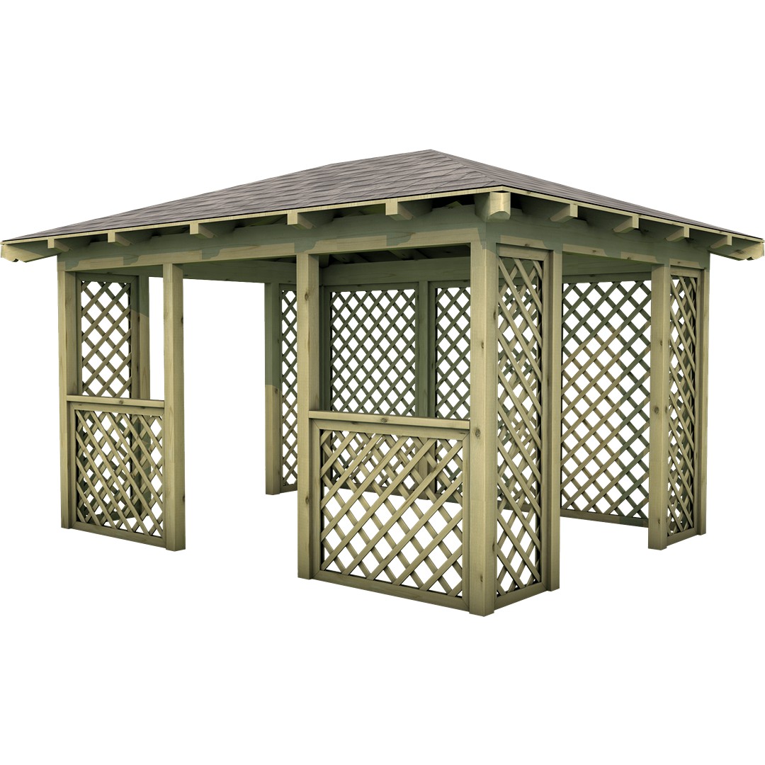 Gazebo a pianta rettangolare realizzato con legno di pino silvestre impregnato in autoclave oppure, su richiesta, in legno di larice. Struttura portante composta da montanti verticali sez. 95×95 mm, Elementi di copertura Sez. 80×120 mm - Sez. 100×160 mm. Copertura con telo in pvc. Disponibile anche con tetto in perline di notevole spessore + tegole canadesi. Inoltre è possibile arricchire il vostro gazebo scegliendo tra un’ampia gamma di accessori tra cui grigliati, fioriere e vari tipi di pavimentazioni. Dimensione 350 x 450 x 300 h cm.