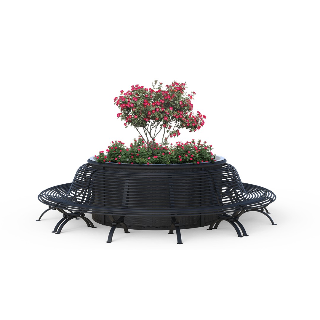 Struttura della fioriera di forma cilindrica, costituita da anello superiore in tubo tondo di acciaio zincato. Fusto perimetrale realizzato in lamiera zincata con fori circolari alternati; il fusto è reso solido da supporti verticali in profilato di acciaio zincato. Vasca interna realizzata in vetroresina colore “grigio chiaro” posizionata su appositi profili di base realizzati in profilato di acciaio zincato. La fioriera è caratterizzata dalla composizione di panchine modello con seduta lato convesso. Ogni panchina è costituita da n° 04 supporti ad arco contrapposti, realizzati in tubo rettangolare zincato adornati da tondi zincati; seduta-schienale realizzata con n° 25 profili curvi in tubo tondo di acciaio zincato completi di tappi terminali in PVC a testa sferica. I profili sono saldati su apposite sagome in ferro piatto zincato, che ne conferiscono la forma anatomica.