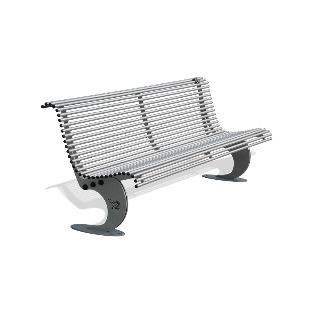 La seduta e lo schienale sono realizzati con ben trentadue profili in tubo tondo di acciaio zincato, saldati su apposite sagome che conferiscono alla panchina una seduta confortevole ed ergonomica.