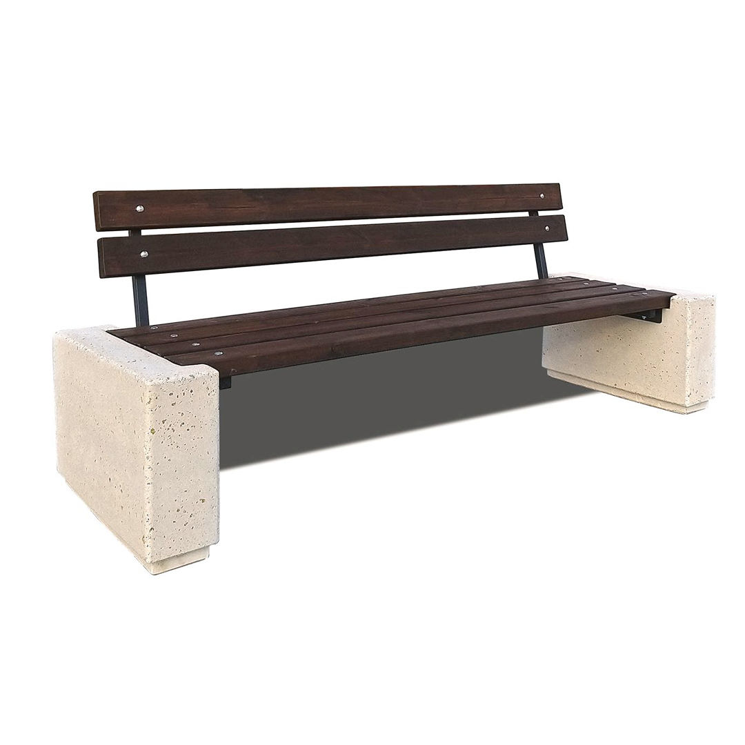 Panchina realizzata con seduta e schienale in doghe di pino silvestre tinto noce e supporti laterali in cemento bianco effetto pietra. Articolo da montare.