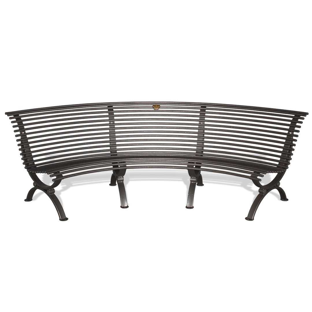 Panchina di forma curva realizzata in tubolari di acciaio zincato, con seduta lato concavo. Struttura realizzata con quattro supporti costituiti da archi contrapposti in tubo rettangolare zincato adornati da tondi zincati. I supporti sono dotati di piastre alla base per il corretto fissaggio al terreno mediante tirafondi e tasselli ad espansione. Scocca seduta e schienale realizzata con venticinque profili curvi in tubo tondo di acciaio zincato completi di tappi terminali in PVC a testa sferica. I profili sono saldati su apposite sagome in ferro piatto zincato che ne conferiscono la forma anatomica. La conformazione della panchina definisce la seduta verso il lato concavo. La panchina viene fornita in kit di assemblaggio con viteria in acciaio inox ed istruzioni per il montaggio. La finitura base per questo prodotto è del colore canna fucile caratterizzato da una cromia grigio scuro dall'effetto metallico. Il cliente può comunque richiedere una finitura differente, a scelta tra i colori RAL a disposizione. Dimensione: 271 x 111 x 83 h cm