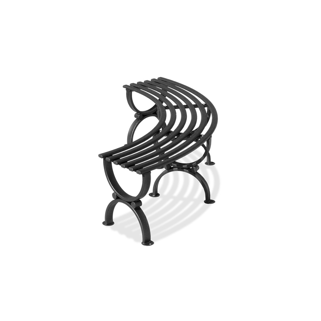 Panca curva per arredo urbano, senza schienale. Struttura composta da quattro supporti ad archi contrapposti, in tubo rettangolare zincato e adornato da tondi zincati, con alla base piastre di ancoraggio al terreno mediante tirafondi e tasselli ad espansione.
