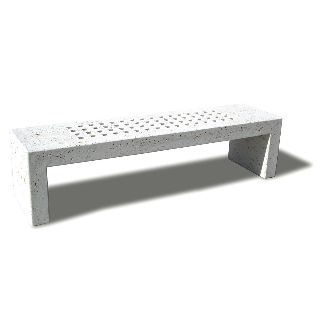 Panchina in calcestruzzo bianco finto travertino, armato, vibrato e levigato, con fori superiori. Trattamento idrorepellente antidegrado per esterno, effetto naturale. Dimensioni cm 200x50x50h - peso Kg 380. Disponibile anche nella versione bianco finto travertino.