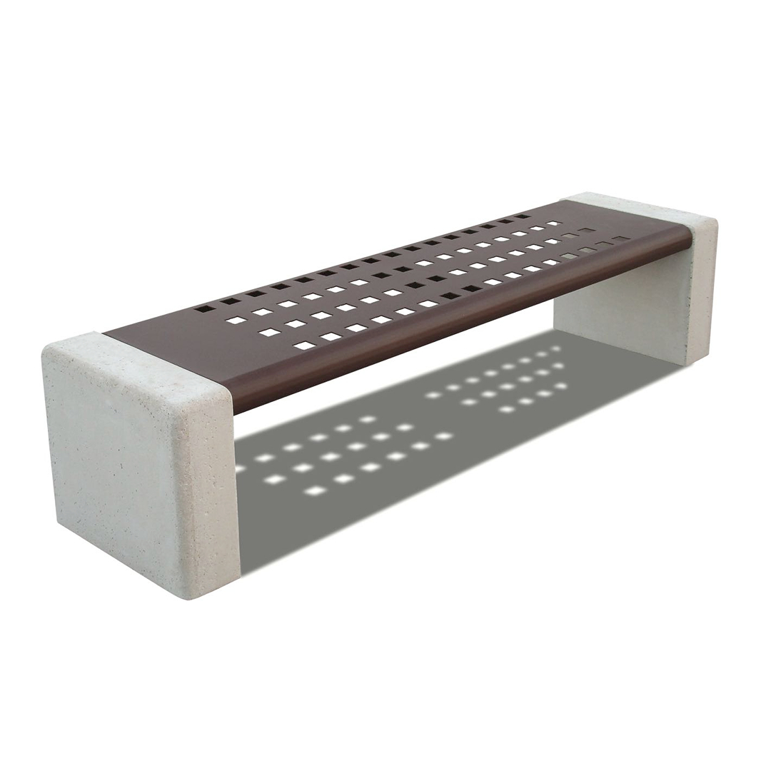 Seduta avente fori passanti, realizzata in acciaio zincato e verniciato color corten, con supporti laterali in calcestruzzo bianco effetto pietra. Articolo da montare.