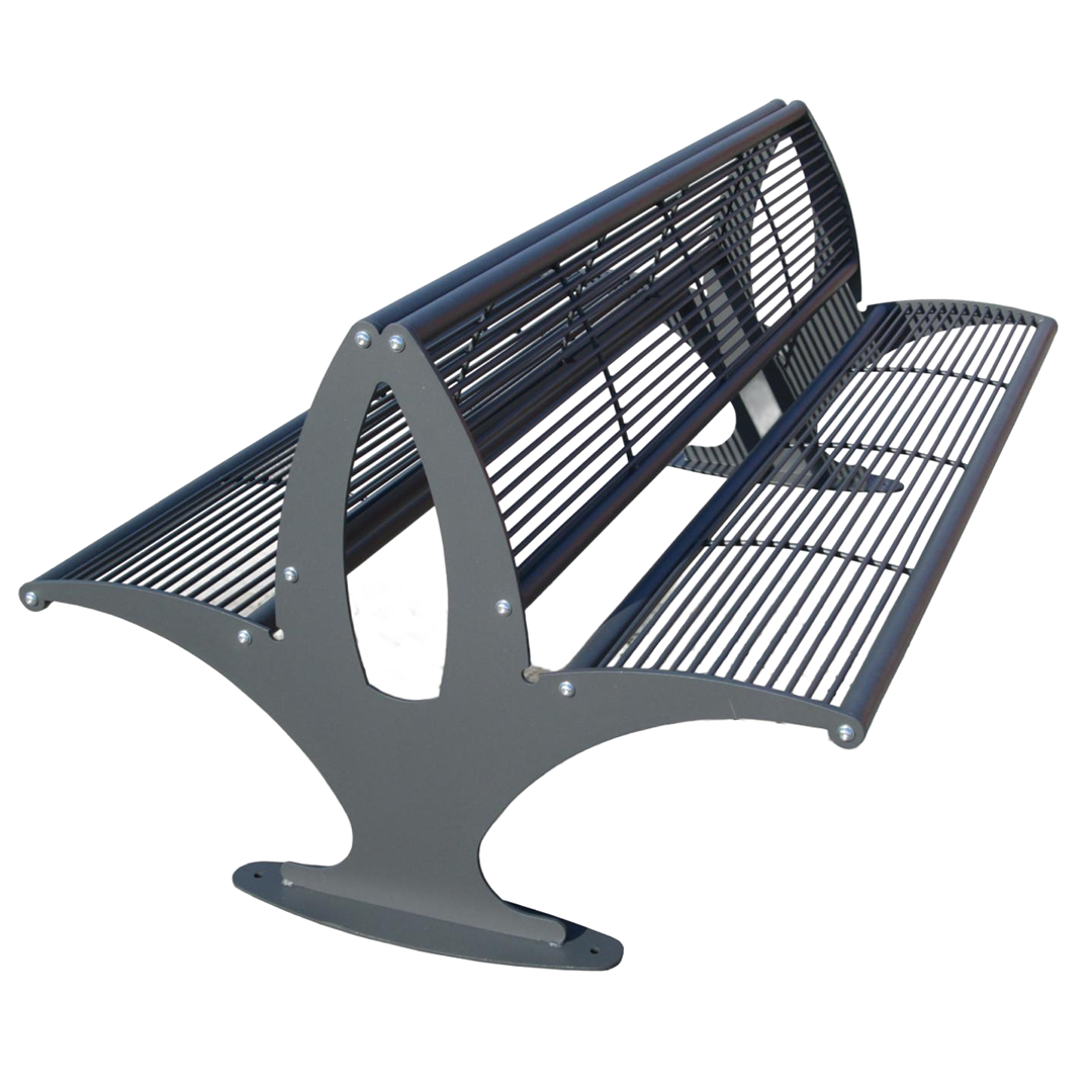 Doppia panchina composta da due supporti in lamiera sagomata con tecnologia laser spessore 60/10. Seduta e schienale realizzati in profilati tondi d’acciaio diametro mm. 8 e tubolari terminali in acciaio zincato diametro mm. 40.