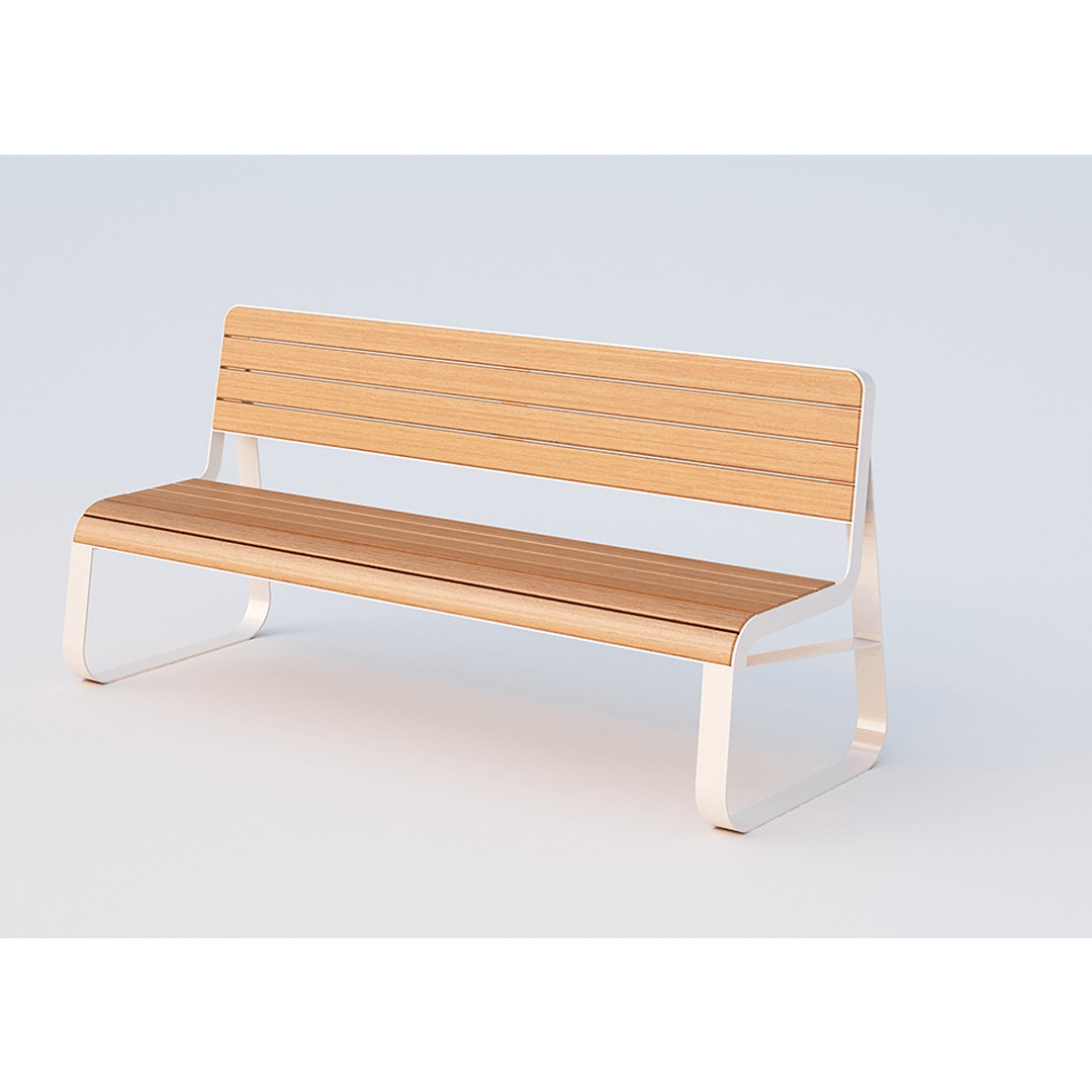 Panchina con struttura in acciaio zincato verniciato di colore bianco perla bucciato, RAL 1013, seduta e schienale con doghe di legno Okumè. Dimensione 190x 70 x 92 h cm