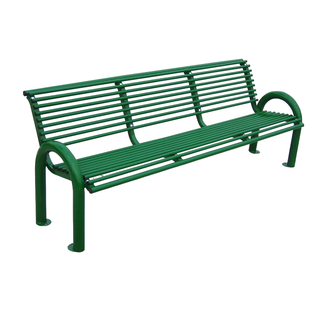 Panchina composta da n. 2 supporti realizzati in tubo tondo d’acciaio zincato diametro mm. 60 piegati ad ”U” capovolta dotati di piastre per l’ancoraggio al suolo. Seduta e schienale realizzati mediante tubo tondo d’acciaio zincato diametro mm. 20 dotati all’estremita’ di copritesta alettato in PE colore nero. Munita di tenute centrali realizzate in tubolare d’acciaio zincato.