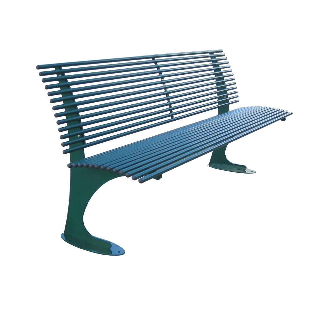 Panchina composta da n. 2 supporti in lamiera sagomata con tecnologia laser spessore 60/10 dotati di piastra ovale per l’ancoraggio al suolo. Seduta e schienale realizzati in tubo tondo d’acciaio zincato diametro mm. 20 con all’estremita’ puntali a testa sferica alettati in PE colore nero.
