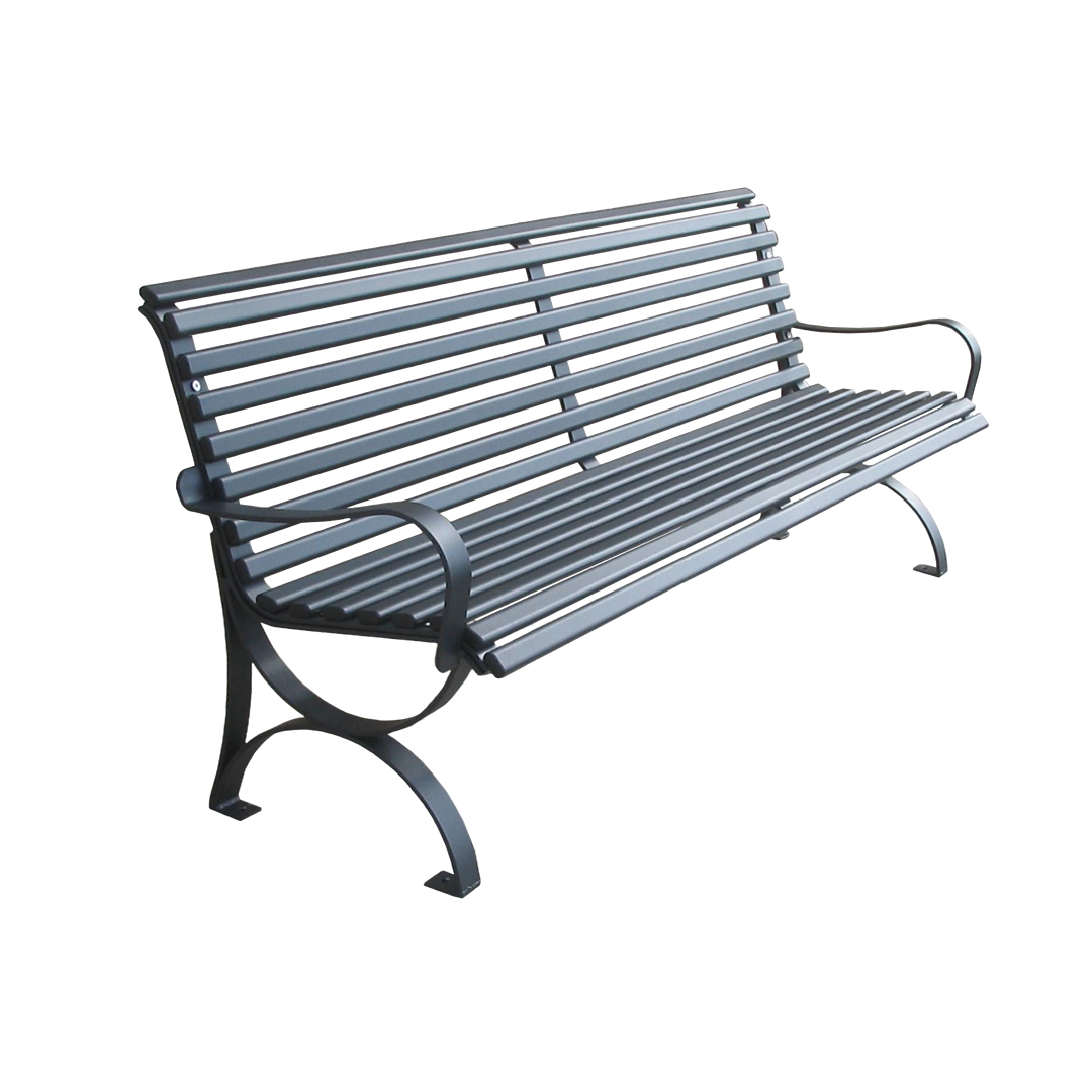 Panchina composta da n. 2 supporti con bracciolo realizzati in ferro piatto zincato mm. 50 x 8. Seduta anatomica realizzata mediante doghe in tubolare ovale d’acciaio zincato sezione mm. 40 x 20 lunghezza cm 200 dotate di copritesta alettato in PE colore nero.
