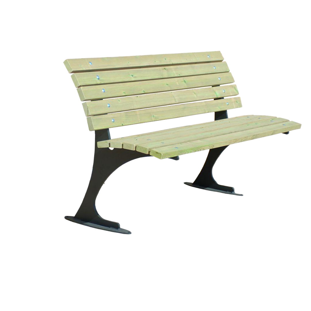 Panchina composta da n. 2 supporti in lamiera sagomata con tecnologia laser spessore 60/10 dotati di piastra ovale per l’ancoraggio al suolo. Seduta e schienale realizzati mediante doghe in legno di pino nordico impregnato in autoclave mediante sali atossici sez. mm. 70 x 30 x 1500.