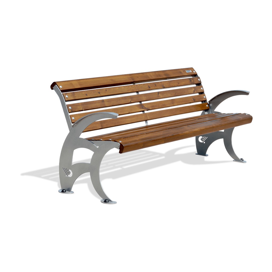 Panchina per arredo urbano con seduta e schienale in listoni di legno. Struttura portante in lamiera di acciaio zincata caratterizzata da due supporti di forma arcuata con intagli decorativi e bracciolo, ricavati da taglio a tecnologia laser. I supporti sono dotati di piastre alla base per l’ancoraggio al terreno a mezzo tirafondi e tasselli ad espansione. Seduta e schienale composta da listoni in legno Okumè. La panchina viene fornita in kit di assemblaggio con viteria in acciaio inox ed istruzioni per il corretto montaggio. La finitura base per questo prodotto è di colore alluminio brillante, caratterizzato da una cromia grigio chiara dall'effetto metallico, il cliente può comunque richiedere una finitura differente, a scelta tra i colori RAL a disposizione. Dimensioni 180 x 68 x 78 h cm - Peso 53 kg