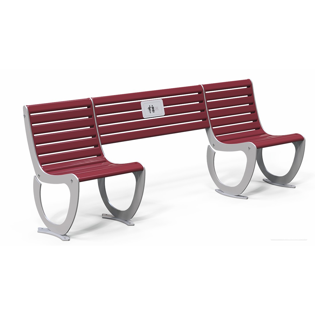 Panchina per spazi pubblici realizzata in acciaio zincato. Struttura composta da due supporti in lamiera di acciaio zincata sagomata con tecnologia al taglio laser, richiamanti, nella forma, la lettera delta stilizzata. Ogni singolo supporto è dotato di piastra alla base. Scocca seduta e schienale realizzata con profili di acciaio zincato a sezione ovale. La seduta si compone di parte centrale adibita per l'utilizzo da parte di persone diversamente abili con solo schienale, e due parti ai lati dotate di seduta e schienale. i profili sono saldati su apposite sagome in acciaio che conferiscono alla seduta una forma anatomica. La panchina viene fornita in kit di assemblaggio con viteria in acciaio ed istruzioni di montaggio. La finitura base per questo prodotto si compone di due colori, nello specifico: colore “alluminio brillante” per i supporti, colore “rosso vino RAL 3005" per scocca seduta e schienale. Il cliente può comunque richiedere una finitura differente, a scelta tra i colori RAL a disposizione. Dimensioni 200 x 61 x 77 h cm