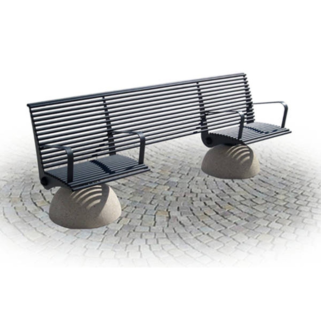 Panchina per arredo urbano. Perfetta in spazi pubblici come parchi , esterni di scuole, centri commerciali, centri sportivi. Composta da N. 4 supporti in lamiera d’acciaio sp. 60/10 sagomati con tecnologia laser. Barra orizzontale in tubo d’acciaio zincato Ø mm. 60X30/10 di spessore e N. 2 basi in calcestruzzo bianco sabbiato trattato antidegrado. Seduta e schienale composte complessivamente da profili in tubo tondo d’acciaio zincato Ø mm. 20x15/10 chiusi all’estremità da tappi semisferici in PE colore nero. Al centro della panchina è ricavato uno spazio provvisto solo di schienale, estremamente utile per passeggini o sedie a rotelle. Panchina dotata di braccioli. Dimensioni: cm 200 x 65 x 81 h. Panchina costruita secondo requisiti di sicurezza UNI 11306:2009.