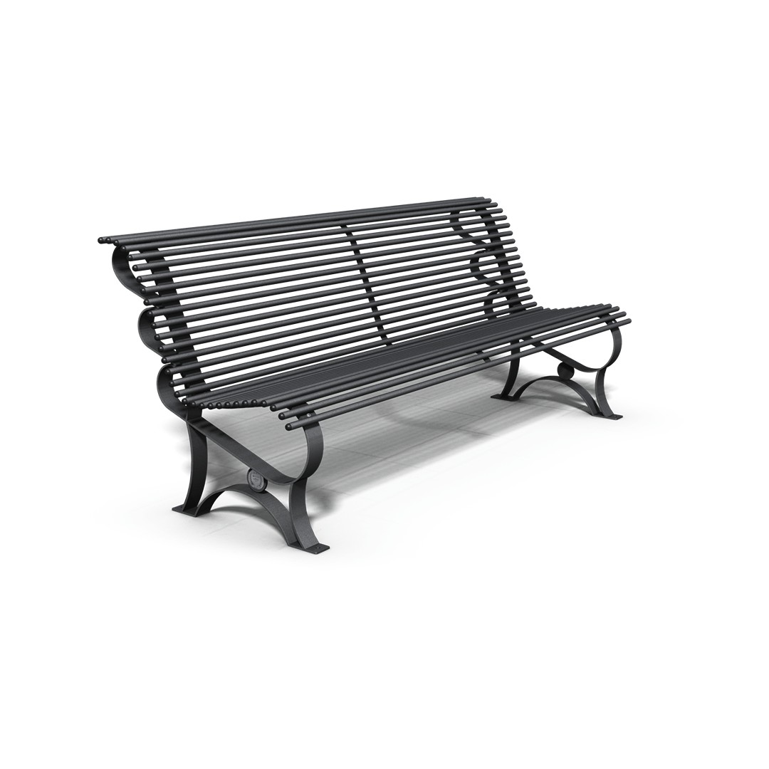 Panchina per arredo urbano in acciaio. Struttura composta da due supporti sagomati in ferro piatto zincato, la parte superiore dei supporti è caratterizzata da tre diverse volute sagomate a mano, in ferro piatto zincato, entrambe dotati di piastre alla base per l’ancoraggio al terreno mediante tirafondi e tasselli ad espansione. Scocca seduta e schienale realizzata con trenta profili in tubo tondo di acciaio zincato provvisti di tappi terminali in PVC a testa sferica. I profili sono saldati su apposite sagome in ferro piatto zincato atte a conferire una forma anatomica. La finitura base per questo prodotto è del colore “canna fucile” caratterizzato da una cromia grigio scuro dall'effetto metallico. Il cliente può comunque richiedere una finitura differente, a scelta tra i colori RAL a disposizione. Dimensioni 150 x 82 x 83 h cm - Peso 71 kg.