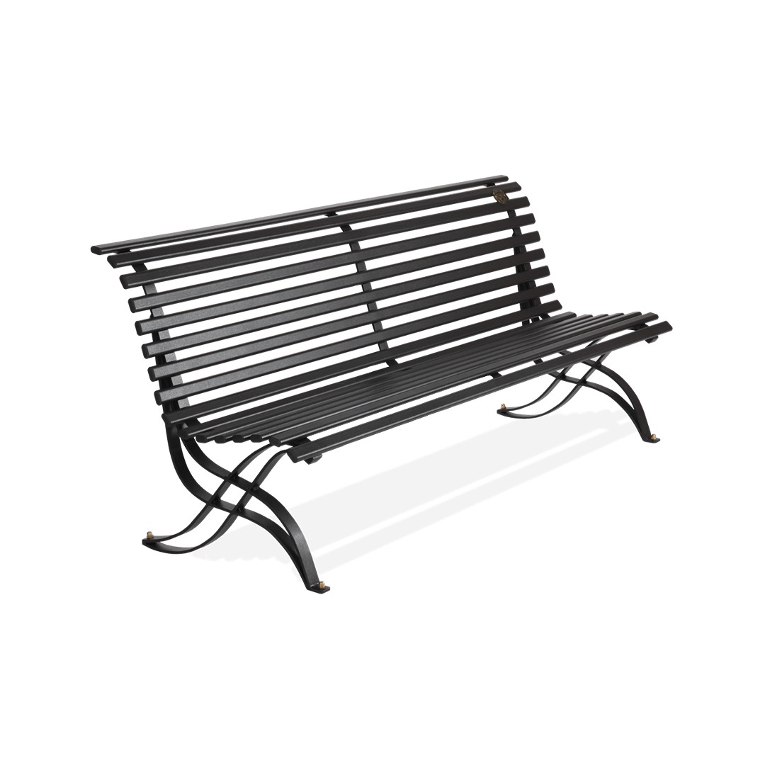 Panchina realizzata in acciaio zincato con seduta e schienale in tubolari a sezione ovale. Composta da due supporti in ferro piatto zincato curvato ed incrociato ad arte sino a formare una solida ed elegante base d’appoggio.