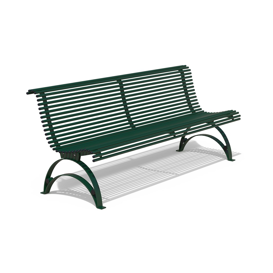 Panchina in acciaio zincato. Struttura composta da due supporti costituiti da due archi in ferro piatto zincato. I supporti sono dotati di piastre forate per l’ancoraggio al terreno a mezzo tirafondi e tasselli ad espansione. La panchina viene fornita in kit di assemblaggio con viteria in acciaio inox e istruzioni di montaggio. Scocca seduta e schienale realizzata con trentadue profili in tubo tondo di acciaio zincato, completi di tappi terminali in PVC a testa sferica. I profili sono saldati su apposite sagome in acciaio zincato, che ne conferiscono la forma anatomica. La finitura base per questo prodotto si compone di due colori, nello specifico, colore “verde muschio” RAL 6005 per i supporti da ancorare al terreno e colore “verde muschio goffrato” RAL 6005 per la scocca seduta e schienale. Il cliente può comunque richiedere una finitura differente, a scelta tra i colori RAL a disposizione. Dimensioni 200 x 70 x 83 h cm