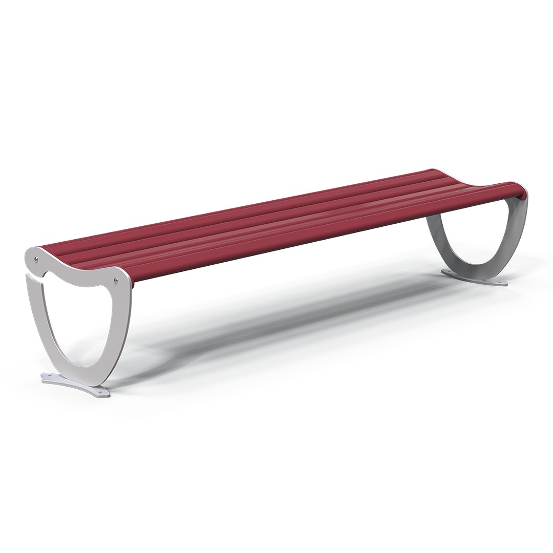 Panca per spazi pubblici realizzata in acciaio zincato. Struttura composta da due supporti in lamiera di acciaio zincata sagomata con tecnologia al taglio laser, dalla forma stilizzata. Ogni singolo supporto è dotato di piastra alla base, utile ai fini dell’ancoraggio al terreno. Scocca seduta realizzata con profili in profilato di acciaio zincato a sezione ovale, saldati su apposite sagome in acciaio che conferiscono alla seduta una forma anatomica. La panca viene fornita in kit di assemblaggio con opportuna viteria in acciaio ed istruzioni di montaggio. La finitura base per questo prodotto si compone di due colori, nello specifico: colore “alluminio brillante” per i supporti, colore “rosso vino” RAL 3005 per scocca seduta. Il cliente può comunque richiedere una finitura differente, a scelta tra i colori RAL a disposizione. Dimensioni 200 x 54 x 45 h cm