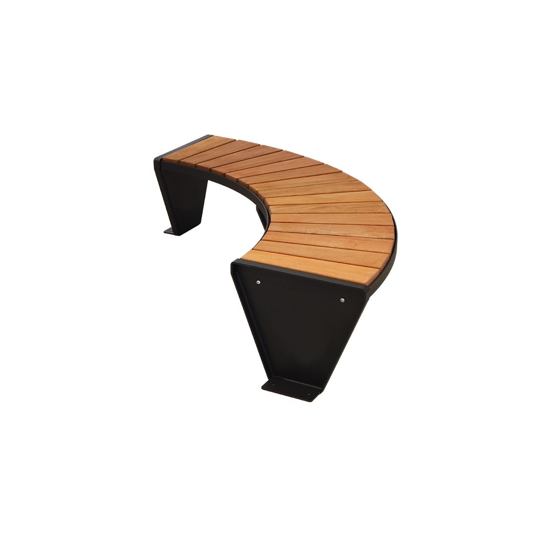 Panca curva costituita da supporti dalla forma stilizzata, ricavati da taglio a tecnologia laser, in lamiera zincata. Ogni supporto è bordato, nella parte esterna, con profilo realizzato in ferro piatto, ed è provvisto di fori per il fissaggio al suolo. Seduta semi-circolare realizzata con listoni in legno di Okumè. La panca curva viene fornito in kit di assemblaggio con viteria in acciaio ed istruzioni per un corretto montaggio. La finitura base per le parti metalliche di questo prodotto è di colore “canna fucile”. Il cliente può comunque richiedere una finitura differente, a scelta tra i colori RAL a disposizione. Dimensioni 205 x 53 x 44 h cm