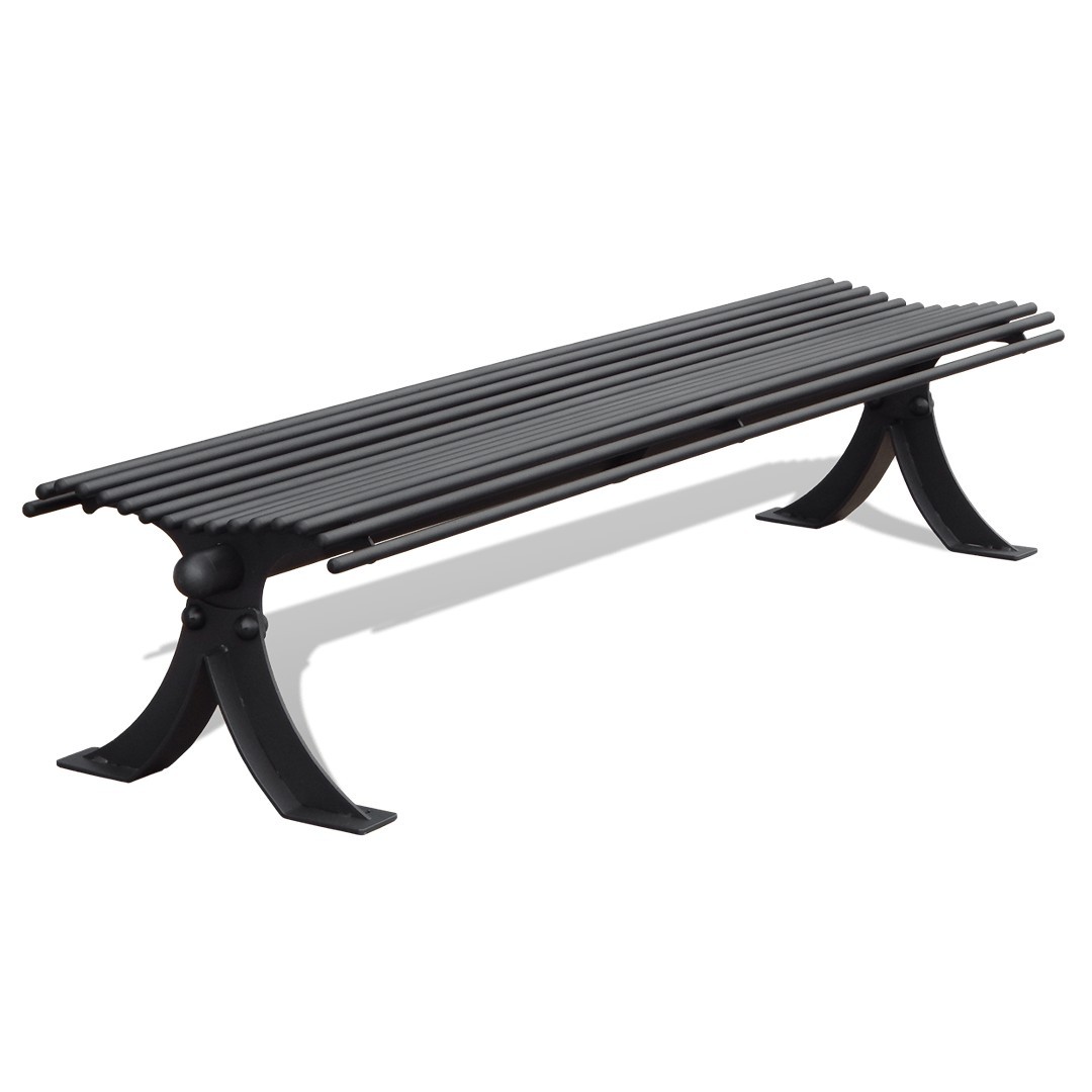 Panca senza schienale per arredo urbano. Struttura realizzata con due supporti a “V” rovesciata ricavati da taglio a tecnologia laser, in lamiera zincata, ogni supporto è bordato, nella parte interna, da piatto zincato ed è provvisto di fori per l’ancoraggio al terreno e collegati con una traversa in tubo tondo di acciaio zincato completa di tappi terminali in PVC a testa sferica. Scocca seduta realizzata con sedici profili in tubo tondo di acciaio zincato completi di tappi terminali in PVC a testa sferica. I profili sono saldati su apposite sagome in acciaio zincato che ne conferiscono la forma anatomica. Il fissaggio avviene mediante piastre forate per l’ancoraggio al terreno a mezzo tirafondi e tasselli ad espansione. La panchina è fornita in kit di assemblaggio con viteria in acciaio inox ed istruzioni per il montaggio. La finitura base per questo prodotto è di colore "canna fucile”. Il cliente può comunque richiedere una finitura differente, a scelta tra i colori RAL a disposizione. Dimensioni 200 x 51 x 41 h cm