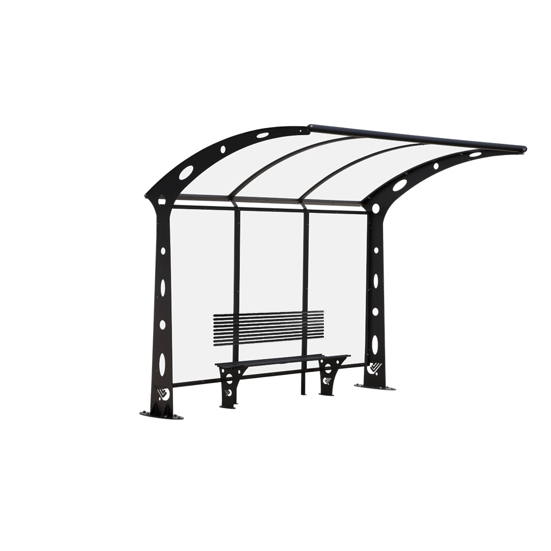 Caratteristiche principali: struttura portante zincata, panca in lamiera, parete in acciaio, grondaia metallica, finestra colori RAL,struttura portante in acciaio zincato con svuotamenti ellissoidali e circolari,panca in lamiera zincata con svuotamenti decorativi e seduta in tubo tondo,parete di fondo in acciaio zincato con copertura in policarbonato alveolare,grondaia per raccolta acque meteoriche in struttura metallica,finestra personalizzabile in colori RAL per strutture metalliche esterne