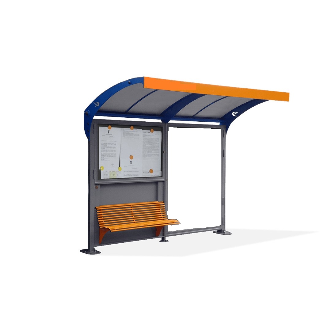 Costituito da parete di fondo in scatolato di acciaio zincato, inglobata tra i montanti verticali della pensilina al fine di evitare qualsiasi sporgenza esterna. Anta apribile a libro, per l’inserimento di eventuale poster pubblicitario, in profilati di acciaio zincato munita di chiusura a chiave (cifratura unica). Lato di lettura realizzato in policarbonato compatto trasparente, infrangibile, protetto ai raggi UV e particolarmente adatto per l’esterno.