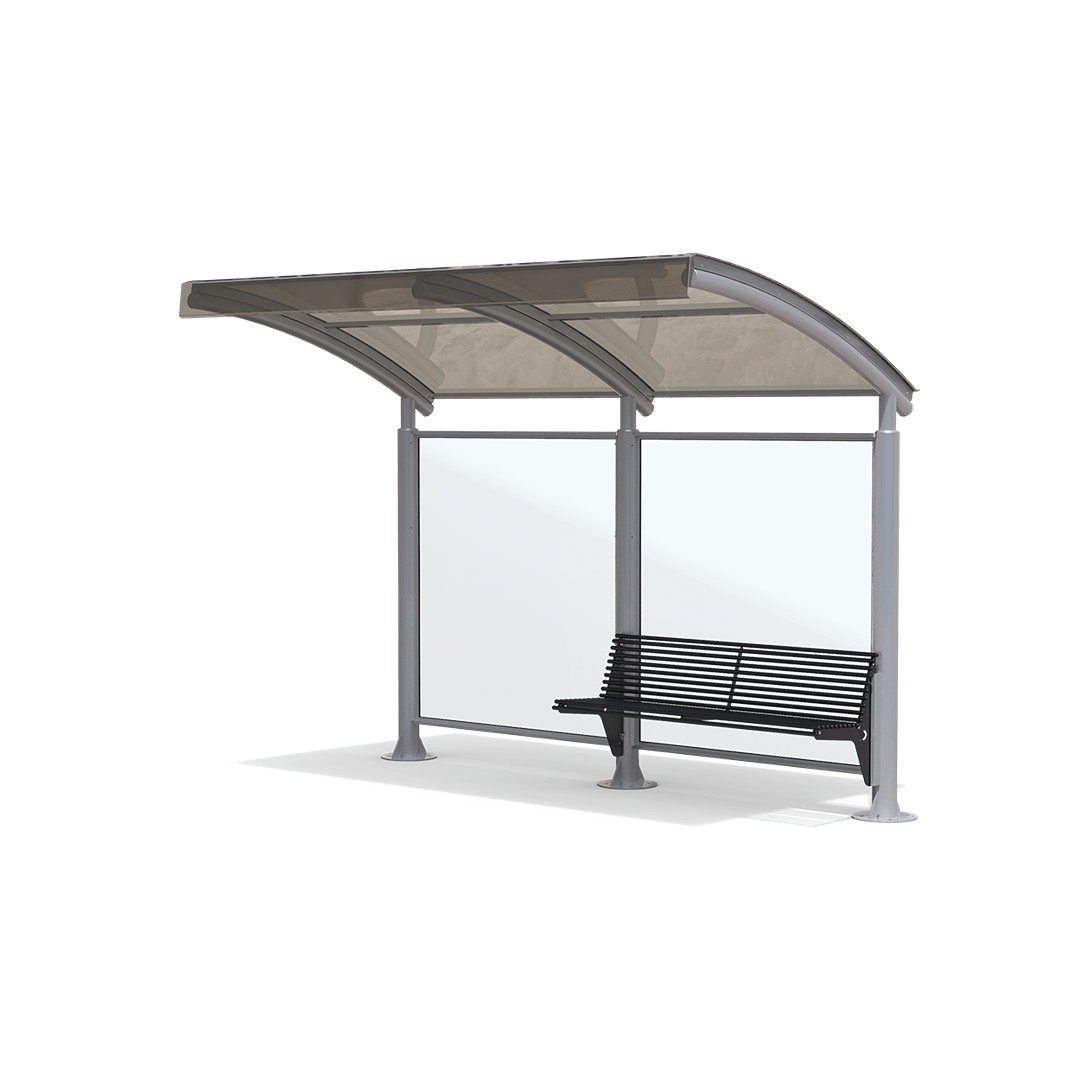 Montanti realizzati in tubo tondo di acciaio zincato completi di piastra alla base per il fissaggio al terreno a mezzo tirafondi e tasselli ad espansione. Parete di fondo costituita da telai in profilato angolare atto ad ospitare il vetro stratificato trasparente, a filo lucido, comprensivo di ferma-vetro e guarnizioni perimetrali. La copertura superiore è in policarbonato, colore fumè, di tipo infrangibile, protetto ai raggi UV e particolarmente adatto all'uso in ambienti esterni. Nella parte anteriore della copertura, a mezzo presso-piegatura, è realizzata una bandella destinata ad ospitare un adesivo in PVC, quest'ultimo può essere richiesto come optional ed è stampato su materiale ad alta resistenza. Panca con seduta e schienale realizzata con ventuno profili di tubo tondo di acciaio zincato e supporti di forma anatomica ricavati da intaglio laser ed ancorati a due montanti della pensilina. La finitura base per questo prodotti si compone di due colori nello specifico, alluminio brillane per la struttura e colore canna fucile per la panchina. Dimensioni: Larghezza 321 cm. Profondità 180 cm. Altezza 250 cm. Dima di installazione opzionale.