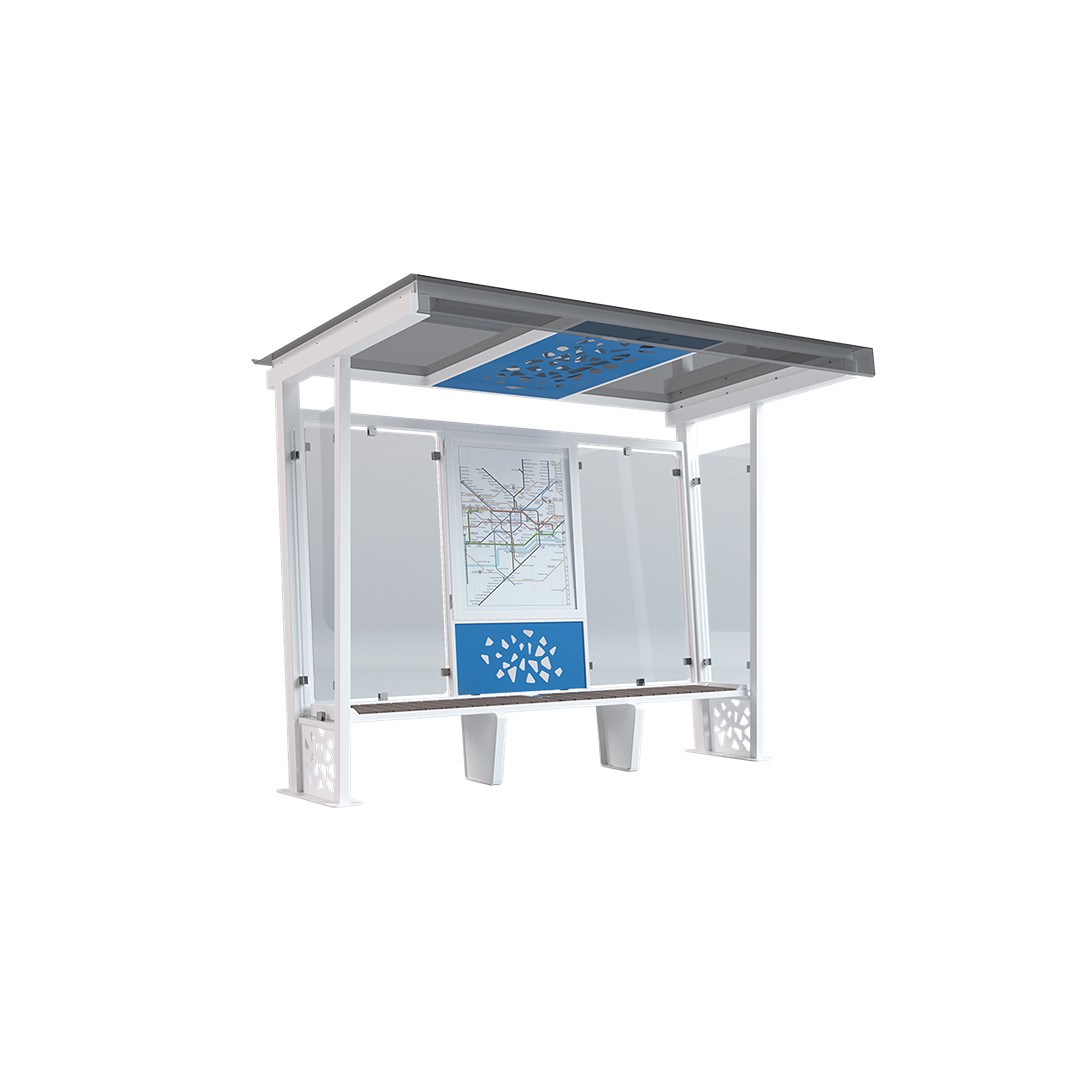 Struttura composta da montanti verticali e traverse superiori in tubolare di acciaio zincato a sezione quadra, pannelli sagomati laterali con intagli stilizzati e piastre di base dotate di fori per il fissaggio al suolo. Pareti laterali costituite da sagome in vetro stratificato trasparente sorrette da appositi morseti in acciaio inox. Parete di fondo realizzata in profilati di acciaio zincato, suddivisa in tre moduli ciascuno composto da sagoma in vetro stratificato trasparente assicurata da appositi morsetti in acciaio inox. Pannello centrale in lamiera zincata caratterizzato da intagli stilizzati ricavati da taglio laser. Seduta che si sviluppa per l’intera larghezza della pensilina realizzata con listoni sagomati in legno tipo Okumè, e dotata di supporti intermedi sagomati, realizzato in profili di acciaio zincato. Copertura costituita da telaio in profili rettangolari di acciaio zincato e tamponamento superiore in policarbonato, colore fumè, di tipo infrangibile, protetto ai raggi UV e particolarmente adatto all'uso in ambienti esterni. Nella parte anteriore della copertura, a mezzo presso-piegatura, è realizzata una bandella destinata ad ospitare un adesivo in PVC, quest'ultimo può essere richiesto come optional ed è stampato su materiale ad alta resistenza. La parte posteriore presenta sagomatura che costituisce gronda per lo scolo delle acque meteoriche. Cosi come per la parete posteriore anche il tetto presente nella parte centrale di un pannello caratterizzato da intagli stilizzati ricavati da taglio laser che creano un effetto suggestivo con il passaggio dei raggi del sole dalla copertura in policarbonato. La finitura base per le parti metalliche di questo prodotto si compone di due colori, nello specifico: colore “bianco puro opaco RAL 9010” e colore “blu luce opaco RAL 5012” per il pannello centrale posteriore e del tetto. Il cliente può comunque richiedere una finitura differente, a scelta tra i colori RAL a disposizione Dimensione 311 x 172 x H. 250 cm