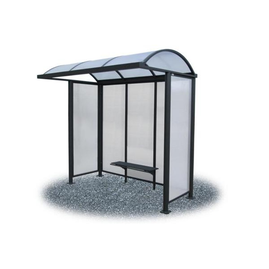 PENSILINA CERTIFICATA DA TECNICO ABILITATO. Pensilina composta da montanti in tubo tondo d'acciaio zincato con parete di fondo realizzata in tubolare d'acciaio zincato e policarbonato alveolare trasparente mm. 10. Copertura realizzata in policarbonato alveolare mm 6 antisfondamento colore fume' per una maggiore protezione dai raggi solari, sagomato a sesto ribassato. Tamponamenti delle pareti laterali realizzati in policarbonato alveolare protetto UV di spessore mm 10. Struttura munita di sistema di grondaie per lo scolo delle acque piovane e di panca in tubolare d'acciaio. Ancoraggio: Predisposta per tassellaggio a terra. Ingombro: cm 250 x 150 x 240 h. Kit di montaggio.
