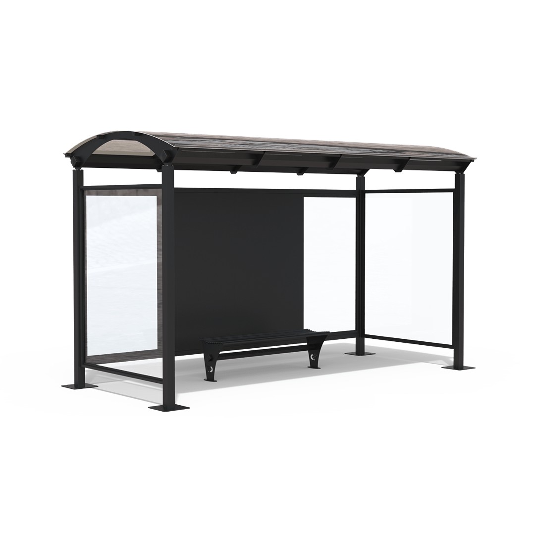 Struttura composta da quattro montanti verticali realizzati in tubo quadro di acciaio zincato, ogni singolo montante è completo di piastra alla base realizzata in lamiera zincata e provvista di fori circolari per il passaggio al terreno. Cinque arcate superiori sagomate, in lamiera zincata ricavate da taglio plasma ad alta definizione, collegate tra loro da traverse orizzontali in tubo quadro di acciaio zincato. Ogni traversa è contraddistinta da terminali sagomati in acciaio zincato. Parete di fondo costituita da due traverse (superiore ed inferiore) in tubo quadro di acciaio zincato, moduli centrali costituiti da scatolato in lamiera zincata, moduli laterali in vetro stratificato trasparente a filo lucido, inserito in apposito telaio con opportune guarnizioni perimetrali e sostenuto da ferma-vetro in acciaio zincato. Pareti laterali costituite da telaio in profilati di acciaio zincato, vetro stratificato trasparente a filo lucido, inserito nel telaio con apposite guarnizioni perimetrali e sostenuto da ferma-vetro in acciaio zincato. Copertura realizzata in policarbonato compatto fumé, infrangibile, protetto ai raggi UV e particolarmente adatto per l’esterno. La copertura è caratterizzata, nella parte anteriore e posteriore da grondaia, formata da apposita sagomatura del pannello per la raccolta e lo scolo delle acque meteoriche. Panca costituita da due supporti, armonizzati alle arcate superiori, in lamiera zincata, ricavati da taglio plasma ad alta definizione; i supporti sono collegati tra loro da traversa in tubo quadro di acciaio zincato. Due piastre di base, saldate ai supporti, realizzate in lamiera zincata. Entrambe le piastre sono provviste di fori circolari per il fissaggio al terreno. Seduta a dodici profili in tubo tondo di acciaio zincato completi di tappi terminali in PVC a testa sferica. La finitura base per questo prodotto è di colore canna fucile. Il cliente può comunque richiedere una finitura differente, a scelta tra i colori RAL a disposizione. Dimensioni: Larghezza 419 cm. Profondità 200 cm. Altezza 252 cm.