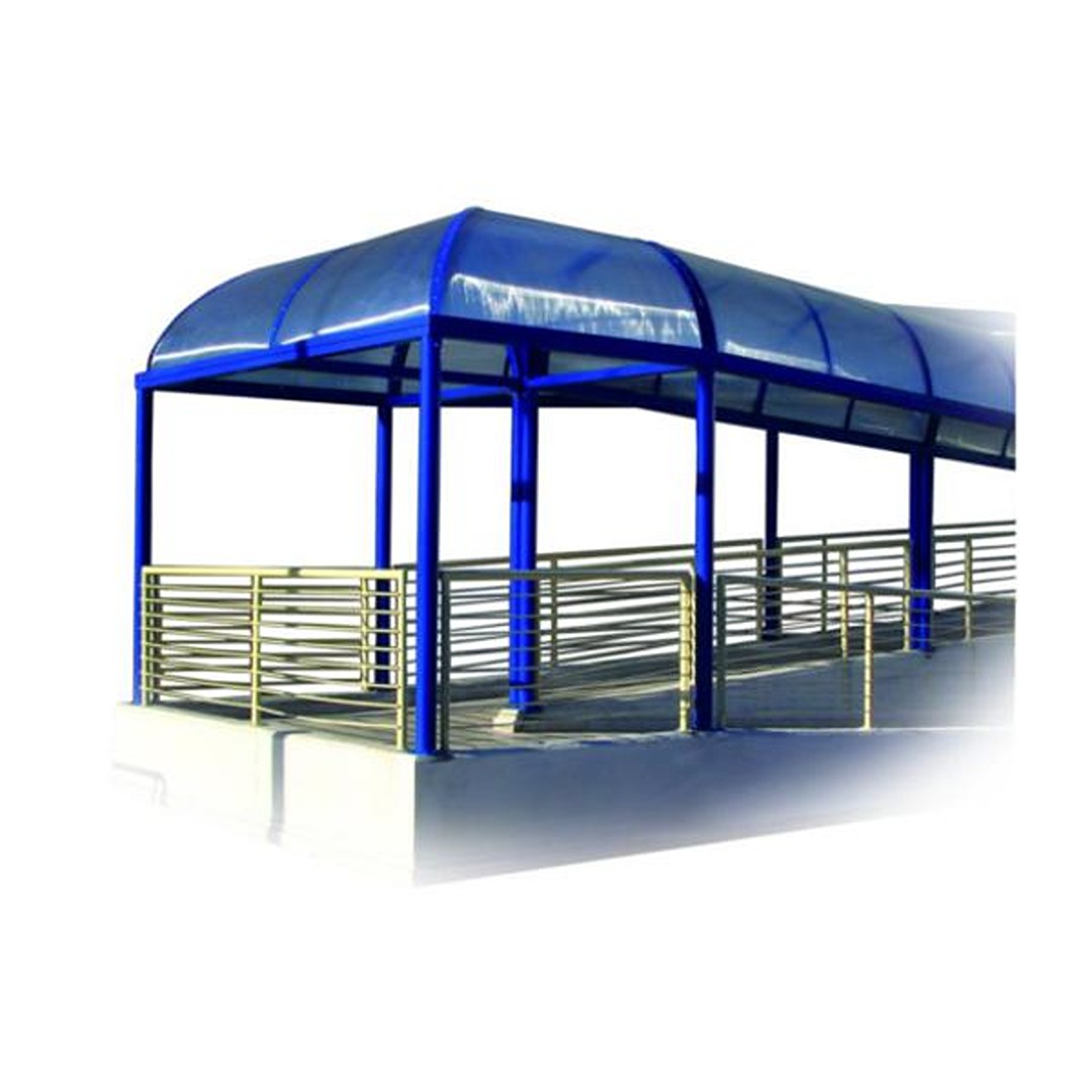 Copertura composta da centine in tubolare d’acciaio zincato mm. 40×30 e policarbonato alveolare trasparente mm. 6 protetto UV, disponibile nella versione fume’ senza sovrapprezzo.