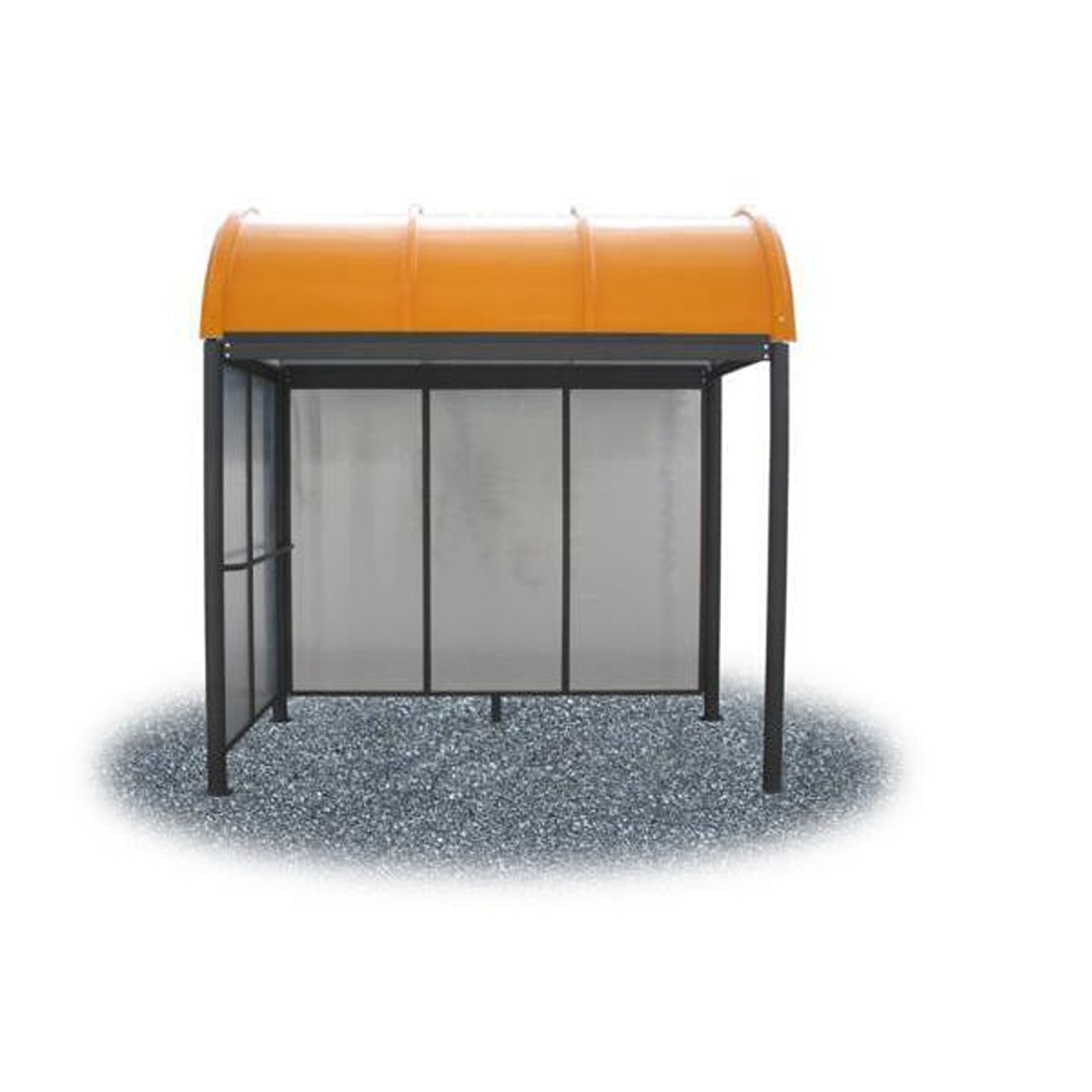 Pensilina composta da montanti in tubo tondo d'acciaio zincato. Copertura realizzata in vetroresina multistrato sagomata di forma semicircolare, con bordature superiori di rinforzo. Tamponamento delle pareti in policarbonato alveolare. Ingombro: cm 280 x 188 x 280 h. Colore standard: struttura grigio antracite, copertura gialla. Ancoraggio: filo al terreno. Accessori Versione Standard: Maniglione di sostegno nella parte interna, tamponamento laterale, timpano destro. Kit di montaggio.