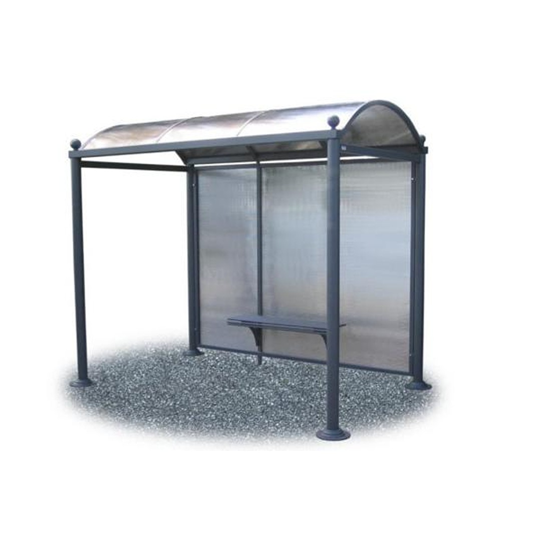 Pensilina composta da montanti in tubo tondo d'acciaio zincato diametro mm. 90 con parete di fondo realizzata in tubolare d'acciaio zincato. Copertura realizzata in policarbonato alveolare antisfondamento colore fume' per una maggiore protezione dai raggi solari, sagomato a sesto ribassato. Tamponamento della parete posteriore realizzato in policarbonato alveolare protetto UV di spessore mm 10. Struttura munita di sistema di grondaie per lo scolo delle acque piovane e di panca cm 100 in tubolare d'acciaio zincato. Ancoraggio: Predisposta per tassellaggio a terra. Ingombro: cm 269 x 173 x 254 h. Kit di montaggio.
