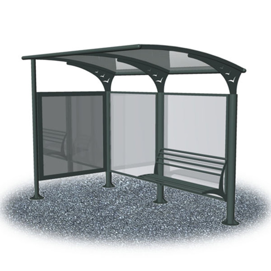 Dispone di panchina incorporata e pareti laterali e tetto in policarbonato alveolare trasparente, resistente ai raggi UV e agli urti, in colorazione fumé.