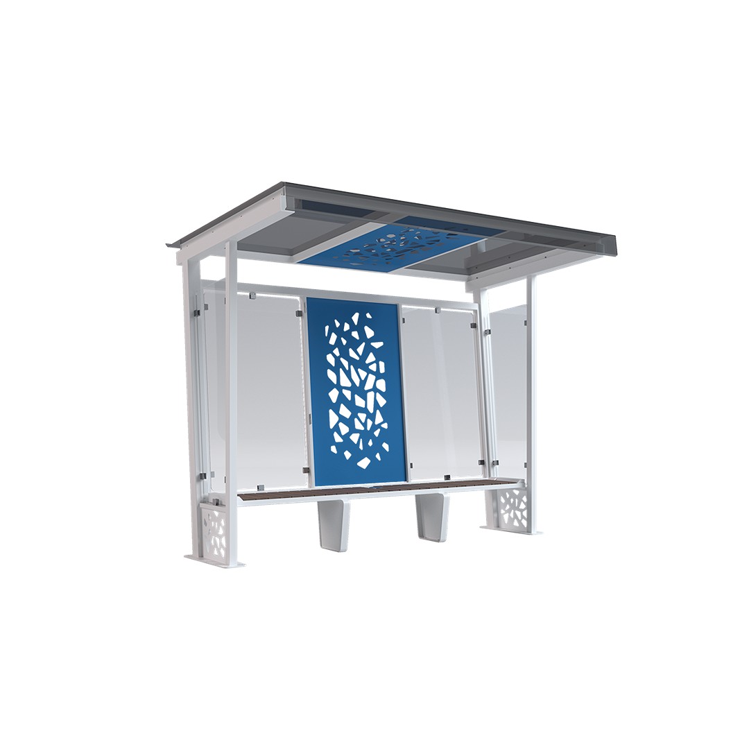 Struttura composta da montanti verticali e traverse superiori in tubolare di acciaio zincato a sezione quadra, pannelli sagomati laterali con intagli stilizzati e piastre di base dotate di fori per il fissaggio al suolo. Pareti laterali costituite da sagome in vetro stratificato trasparente sorrette da appositi morseti in acciaio inox. Parete di fondo realizzata in profilati di acciaio zincato, suddivisa in tre moduli ciascuno composto da sagoma in vetro stratificato trasparente assicurata da appositi morsetti in acciaio inox. Pannello centrale in lamiera zincata caratterizzato da intagli stilizzati ricavati da taglio laser. Seduta che si sviluppa per l’intera larghezza della pensilina realizzata con listoni sagomati in legno tipo Okumè, e dotata di supporti intermedi sagomati, realizzato in profili di acciaio zincato. Copertura costituita da telaio in profili rettangolari di acciaio zincato e tamponamento superiore in policarbonato, colore fumè, di tipo infrangibile, protetto ai raggi UV e particolarmente adatto all'uso in ambienti esterni. Nella parte anteriore della copertura, a mezzo presso-piegatura, è realizzata una bandella destinata ad ospitare un adesivo in PVC, quest'ultimo può essere richiesto come optional ed è stampato su materiale ad alta resistenza. La parte posteriore presenta sagomatura che costituisce gronda per lo scolo delle acque meteoriche. Cosi come per la parete posteriore anche il tetto presente nella parte centrale di un pannello caratterizzato da intagli stilizzati ricavati da taglio laser che creano un effetto suggestivo con il passaggio dei raggi del sole dalla copertura in policarbonato. La finitura base per le parti metalliche di questo prodotto si compone di due colori, nello specifico: colore “bianco puro opaco RAL 9010” e colore “blu luce opaco RAL 5012” per il pannello centrale posteriore e del tetto. Il cliente può comunque richiedere una finitura differente, a scelta tra i colori RAL a disposizione Dimensione 311 x 172 x H. 250 cm