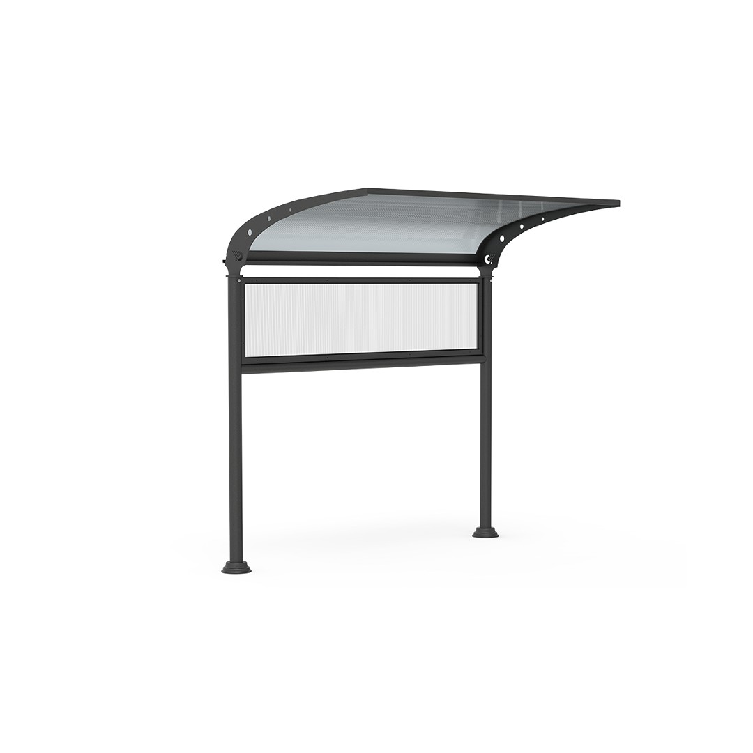 Copertura per panchina realizzata in acciaio zincato. Struttura composta da due montanti verticali in tubo tondo di acciaio completi di flange alla base, decorative, a copertura dei fori praticati per l’ancoraggio della struttura al terreno. Traversa orizzontale di collegamento in tubo tondo di acciaio zincato e centine laterali, nella parte superiore, in lamiera zincata con intaglio e fori decorativi. Le centine sono collegate e rese solidali tra loro mediante telaio in profilati di acciaio zincato. Parete di fondo costituita da telaio perimetrale in profilato angolare di acciaio e policarbonato alveolare tipo trasparente sostenuto da profili in tubo rettangolare. Copertura in policarbonato alveolare tipo opaco e grondaia, nella parte posteriore, per la raccolta e lo scarico delle acque meteoriche. La finitura base per questo prodotto è di colore “canna fucile”. Il cliente può comunque richiedere una finitura differente, a scelta tra i colori RAL a disposizione. Dimensione: 229 x 115 x 227 h cm