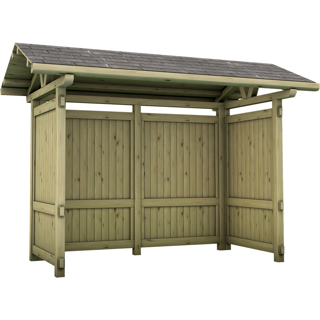 È una struttura classica, ampia, ben rifinita e dall’aspetto accogliente. La struttura portante è in legno massiccio di pino silvestre impregnato in autoclave. Le pareti sono perline di spessore 27 mm. Il tetto a due falde è realizzato con perline di spessore 27 mm, coperte da uno strato di guaina bituminosa ardesiata o da tegole canadesi. È possibile integrare la fermata autobus con pannelli pubblicitari e personalizzarla utilizzando, su richiesta, legno di larice. Dimensioni 370 x 200 x h 280 cm