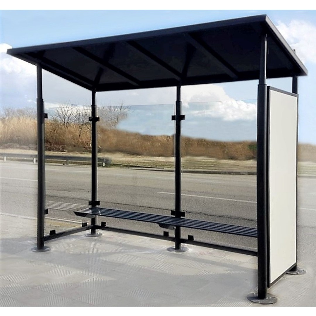 Pensilina per attesa autobus con struttura composta da n. 5 montanti in tubolare tondo d’acciaio zincato Ø mm. 76x3 di spessore e tubo tondo d’acciaio zincato Ø mm. 60, dotati di piastre tonde d’acciaio zincato Ø mm. 250 sp. 50/10. Telaio della copertura composto da tubolare d’acciaio zincato e lastra DIBOND, ovvero doppia lastra in alluminio con nucleo in polietilene, colore NERO. Tamponamento posteriore e laterale in vetro trasparente temperato sp. 10 mm a norme antinfortunistiche supportati da pinze in alluminio. Tamponamento laterale composto da telaio in acciaio zincato e pannelli removibili in DIBOND per affissione messaggi pubblicitari. Panca pensile composta da elementi in lamiera sagomata con tecnologia laser e tubolari ovali sez. mm. 40x20x1,5. Elementi decorativi in tubo tondo d’acciaio zincato sono fissati sulla copertura. Le polveri utilizzate nel processo di verniciatura sono atossiche secondo normative vigenti. Dimensioni: L.300xP.150xh.254 cm Ancoraggio filo al terreno.