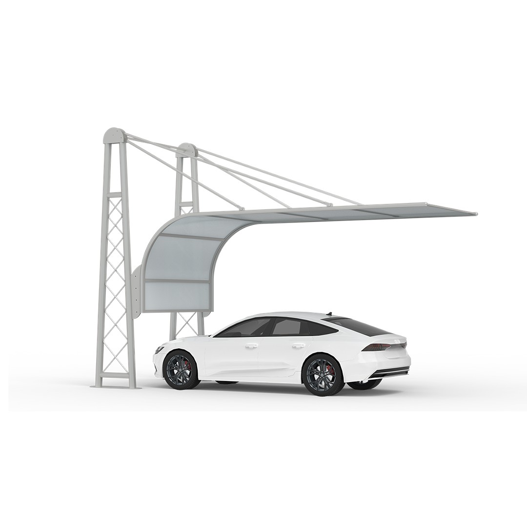 Struttura realizzata con montanti verticali a forma triangolare costituiti da due tubolari tondi di acciaio zincato distanziati da due traverse in tubo tondo di acciaio zincato e decorati, nella parte interna, da un traliccio in tubo tondo di acciaio zincato. Ogni singolo montante è provvisto di piastra, alla base, in lamiera zincata. Tiranti di rinforzo in tubo tondo di acciaio zincato e staffe per il collegamento della copertura ai montanti verticali in lamiera zincata. La copertura, di tipo a sbalzo è realizzata in policarbonato alveolare tipo opaco sostenuta da archi in tubo tondo di acciaio con tappi terminali in PVC a testa sferica e tubo rettangolare di acciaio zincato. Il fissaggio avviene a mezzo plinti o basamento cementizio; tramite prolungamento dei montanti di sostegno nel sottosuolo. La copertura è fornita in kit di assemblaggio con viteria in acciaio inox ed istruzioni per il montaggio. La finitura base per questo prodotto è di colore “alluminio brillante”. Il cliente può comunque richiedere una finitura differente, a scelta tra i colori RAL a disposizione. Dimensione: 250 x 595 x 430 h cm