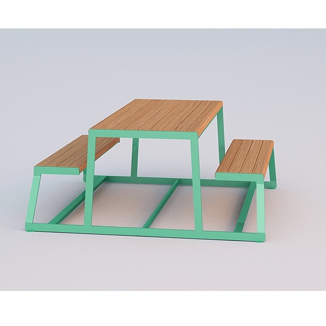 Caratteristiche principali: tavolo picnic, tavolo acciaio, tavolo Okumè, tavolo verde, tavolo personalizzabile,tavolo da picnic in acciaio zincato, tavolo picnic con sedute in legno Okumè, tavolo picnic verde biancastro opaco RAL 6019, tavolo da picnic personalizzabile colori RAL, tavolo picnic con supporti sagomati
