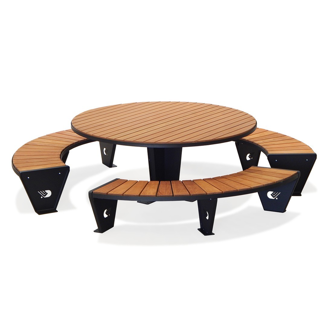 Tavolo caratterizzato dal design circolare. Tavolo circolare costituito da n. 1 supporto centrale sagomato, realizzato in lamiera zincata spessore, ricavato da taglio plasma ad alta definizione, il supporto è bordato nella parte esterna con profilo realizzato in ferro piatto. Il supporto è dotato alla base di fori per il fissaggio al suolo. Piano di appoggio realizzato con listoni in legno di Okumè. Il tavolo viene fornito in kit di assemblaggio con viteria in acciaio inox e istruzioni per un corretto montaggio. La finitura base per le parti metalliche di questo prodotto è di colore “canna fucile”. Il cliente può comunque richiedere una finitura differente, a scelta tra i colori RAL a disposizione. Dimensioni 290 x 290 x 81 h cm
