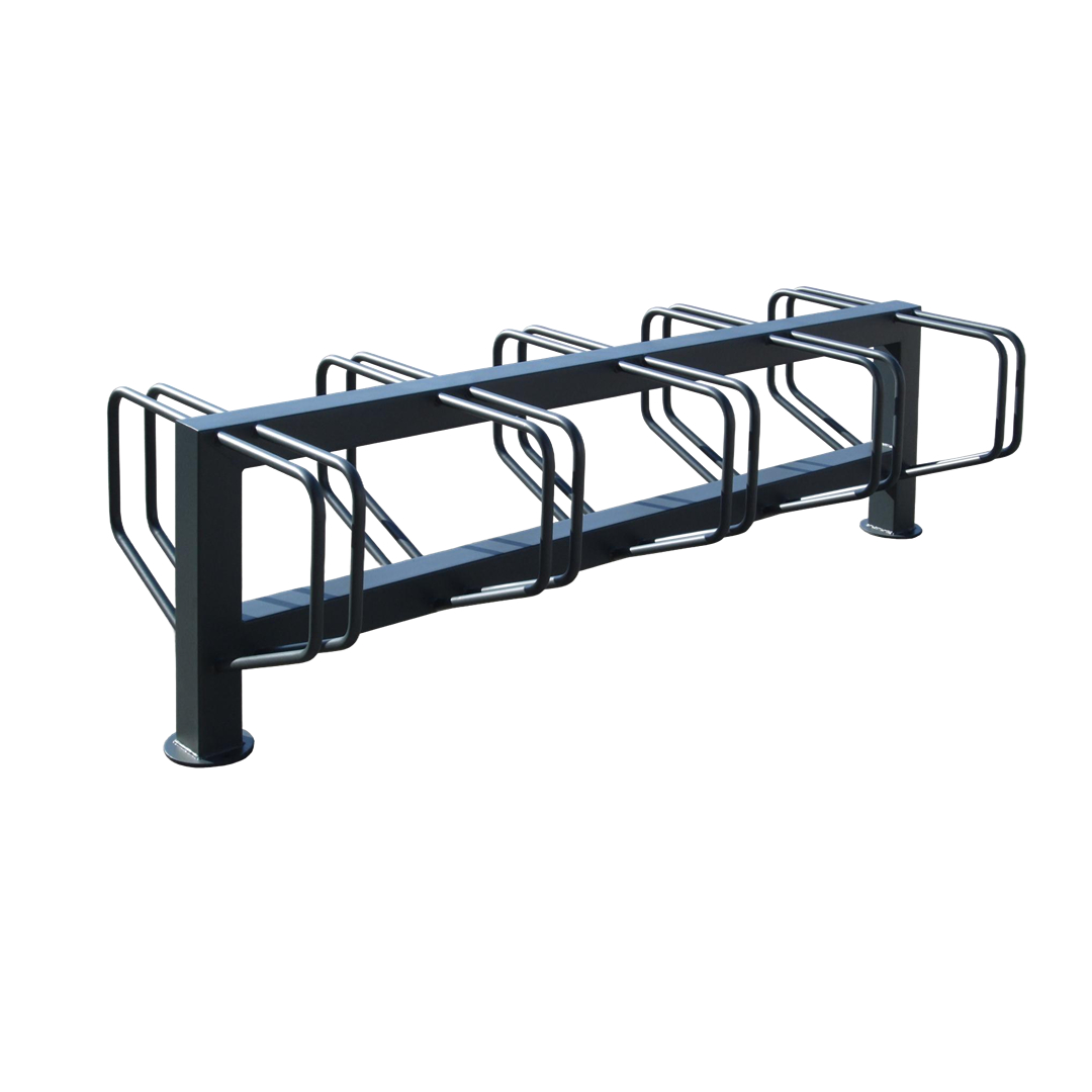 Portabiciclette composto da robusto tubolare d’acciaio zincato mm. 80×80 ed elementi di parcheggio in tubo tondo d’acciaio zincato diametro mm. 25. Dotato di piastre per ancoraggio al suolo.