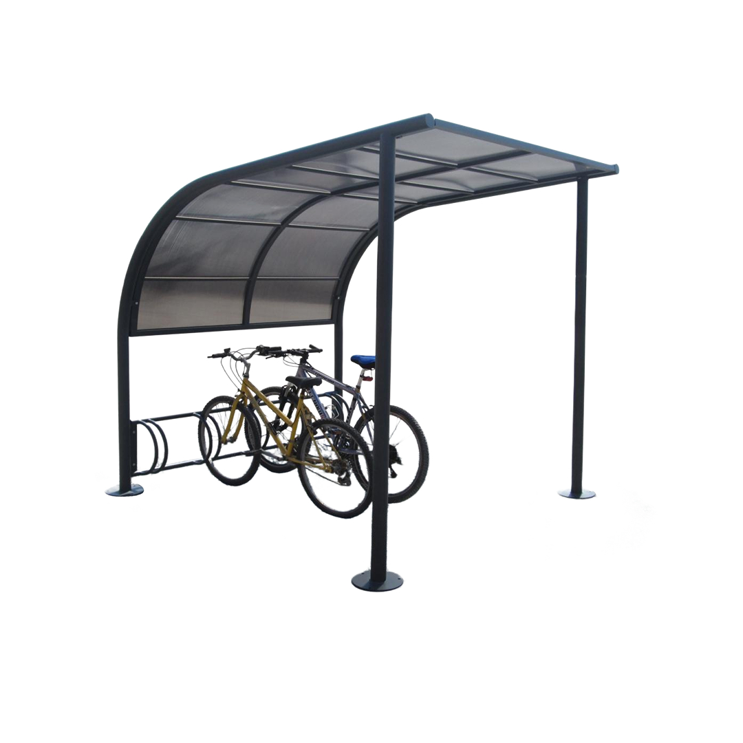 Montanti e parti curve realizzati in tubo tondo d'acciaio zincato. Copertura composta da tubolare in acciaio zincato e policarbonato alveolare trasparente antisfondamento mm. 6 protetto dai raggi UV. Portabiciclette a 5 posti composto da correnti in tubo tondo d'acciaio zincato diametro mm. 40 ed elementi di parcheggio in tubo tondo d'acciaio zincato diametro mm. 25. Montanti muniti di flangia copriforo in acciaio zincato. Ingombro: cm 204 x 247 x 228 h Ancoraggio: da interrare. Kit di montaggio.