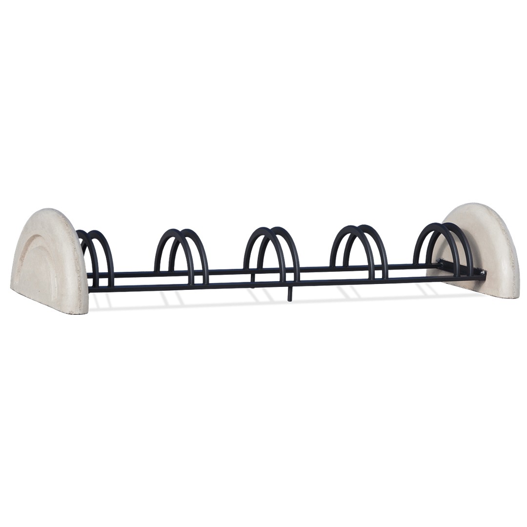 Rastrelliere per biciclette a cinque posti con struttura in metallo e supporti in cemento. Struttura composta da due supporti in cemento CLS di prima scelta, liscio, di colore bianco trattato con speciale liquido protettivo anti-degrado. I supporti in cemento sono dotati di piastre con fori per l’ancoraggio al terreno a mezzo tirafondi e tasselli ad espansione. Due traverse orizzontali di collegamento in tubo rettangolare di acciaio zincato complete di piedini d’appoggio e cinque staffe ferma-bici sagomate ad arco in tubo di acciaio zincato a sezione ovale. Il porta-bici a cinque posti è fornito in kit di assemblaggio con viteria in acciaio inox ed istruzioni per il montaggio. La finitura base per le parti metalliche di questo prodotto è del colore “canna fucile” caratterizzato da una cromia grigio scuro dall'effetto metallico.