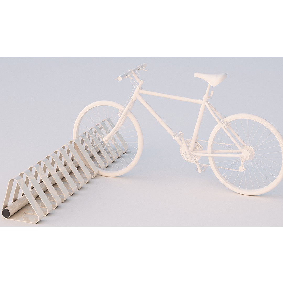 Portabiciclette per arredo urbano. La struttura triangolare è realizzata interamente in acciaio zincato e verniciato di colore "bianco traffico RAL 9016". il cliente può richiedere una finitura a scelta tra i colori RAL a disposizione. Dimensioni 200 x 40 x 34 h cm